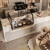 3.لوگوی نورانی یا حکشده: روی بدنهی کانتر میتوان لوگوی برند یا نام کافه را بهصورت حکاکیشده یا نورانی نصب کرد.