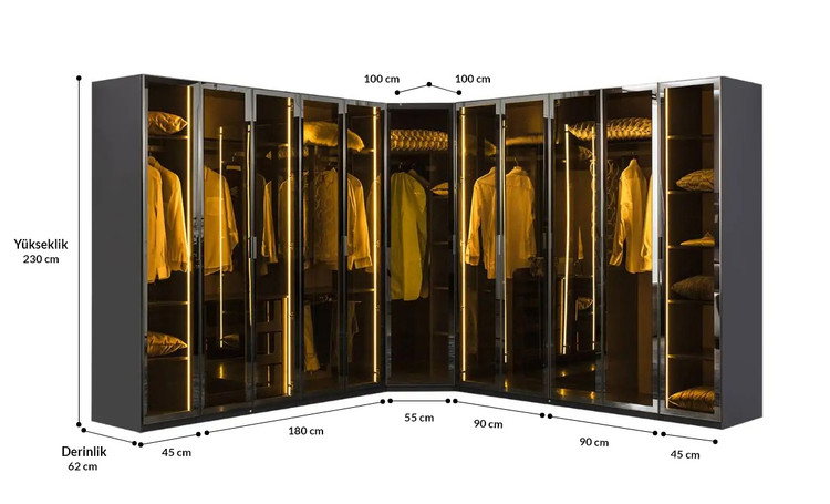 همانند کمد طبقه ای مدل Labradorite پازل، لوازم و تجهیزات مورد استفاده شما باید زندگیتان را در عین زیبایی بخشیدن به خانه شما آسان تر کند. در طراحی مدرن و لوکس، گزینه های با درب شیشه ای و چوبی، هم کاربردی و هم چشمگیر است. با ویژگی درب شیشه ای انعکاسی آن، می توانید یک کابینت گوشه ای شگفت انگیز را هنگامی که با ظرافت در مقابل آن می ایستید، و زمانی که نزدیک تر می شوید، در ترکیب با کمدهای دیگر که کیفیت آن را با سیستم نورپردازی LED حساس به حرکت منعکس می کنند، ایجاد کنید. با ترکیب کابینت های تک درب، دو درب، چهار درب و کمد کنج جایگزین در ابعادی که می خواهید، می توانید رویاهای خود را در سر بپرورانید. بله شما می توانید یک کلوزیت فوق العاده و لوکس داشته باشید.