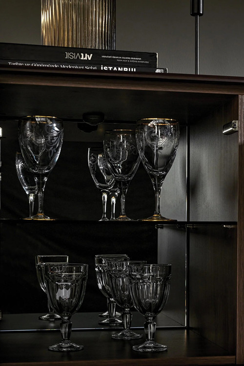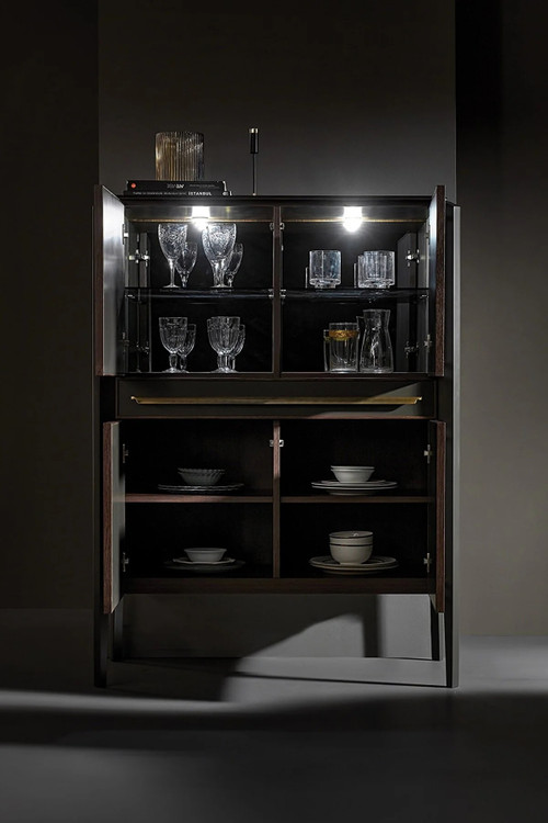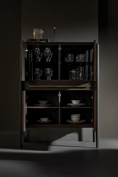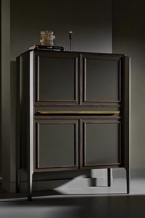 کنسول بار انزا سیرون با استفاده از رنگ خاکستری تیره و دستگیره های طلایی کهنه بر روی بدنه و درب، با ترکیب رنگ گردویی و آنتراسیت، عمق جدیدی به ظرافت می بخشد.