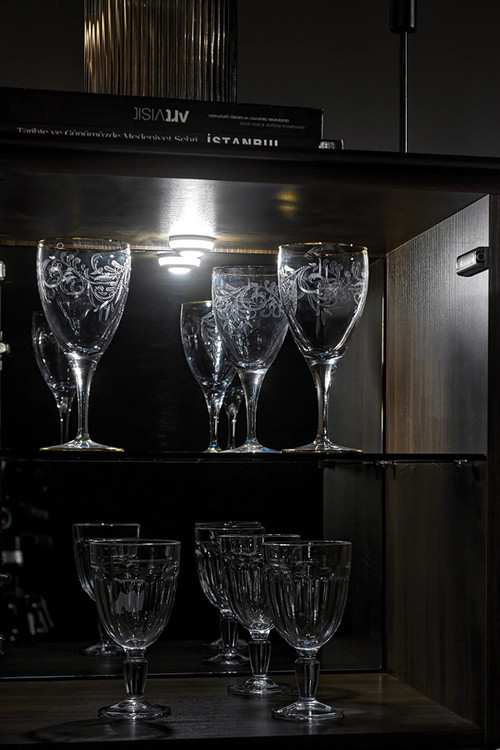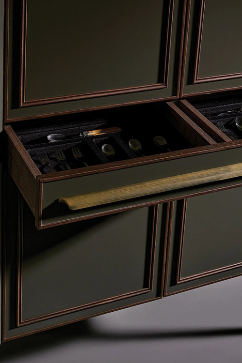 دستگیره های طلایی رنگ تکمیل کننده طرح، استفاده از 2 کشو با کارد و چنگال در ویترین،
