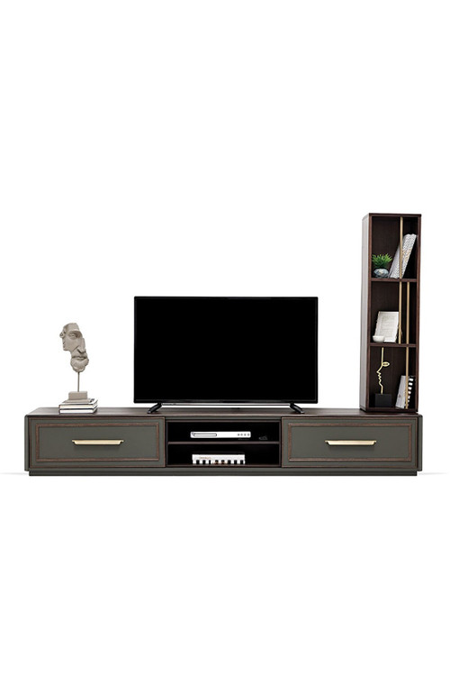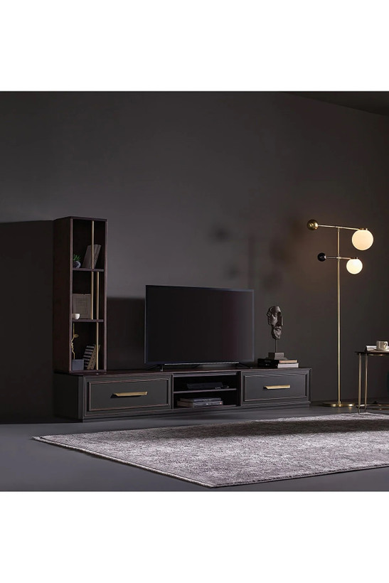 میز تی وی - میز تلویزیون انزا سیرونا با استفاده از رنگ خاکستری تیره و دستگیره های طلایی کهنه بر روی بدنه و درب، با ترکیب رنگ گردویی و آنتراسیت، عمق جدیدی به ظرافت می بخشد.