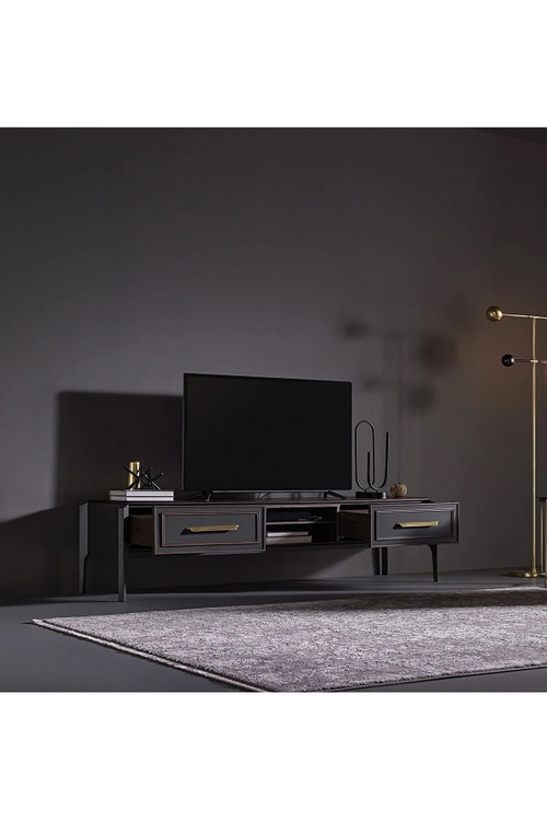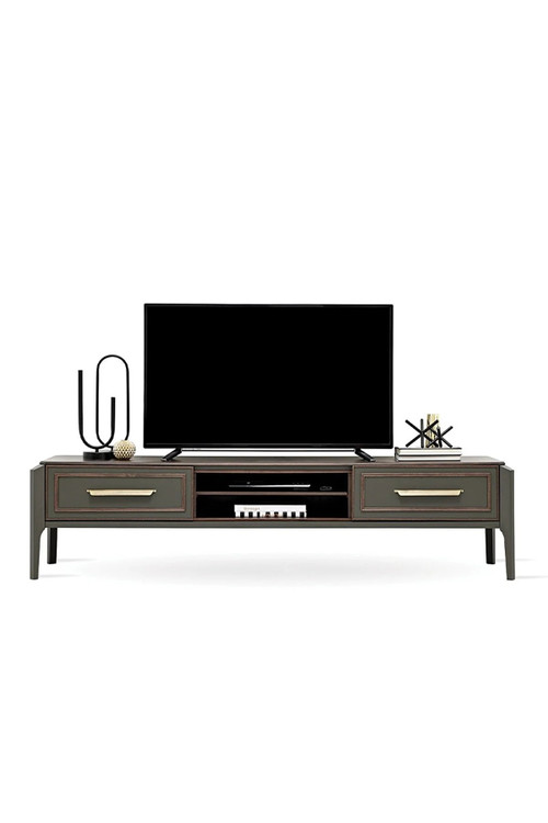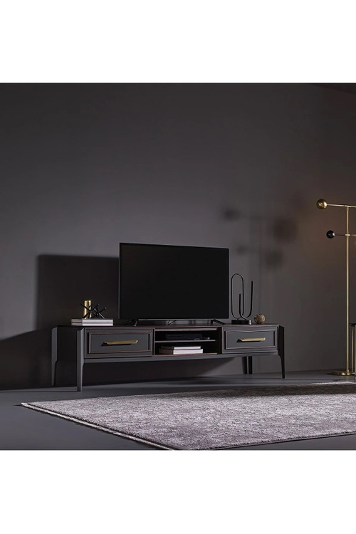 میز تی وی - میز تلویزیون انزا سیرونا پایه دار با استفاده از رنگ خاکستری تیره و دستگیره های طلایی کهنه بر روی بدنه و درب، با ترکیب رنگ گردویی و آنتراسیت، عمق جدیدی به ظرافت می بخشد.